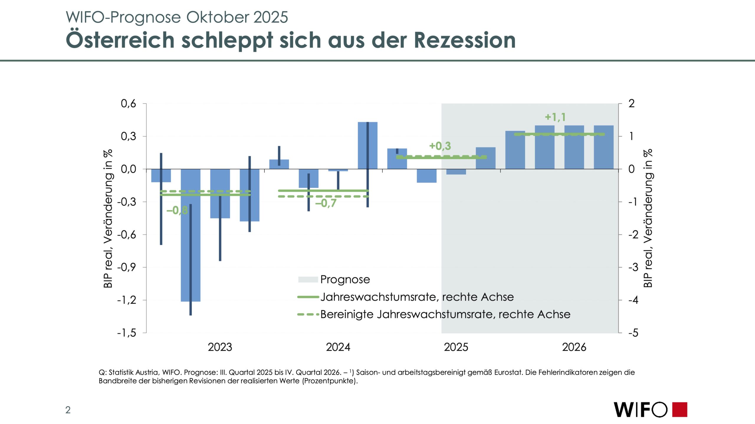 Im Unterschied zu früheren Konjunkturzyklen wird der aktuelle Aufschwung nicht vom Außenhandel, sondern von den privaten Konsumausgaben getragen. Bereits 2024 zeigte sich laut Statistik Austria eine spürbare Belebung im Konsumbereich. Für die Jahre 2025 und 2026 rechnet das WIFO mit einer Fortsetzung dieses Trends, auch wenn steigende Arbeitslosigkeit und eine straffe Haushaltspolitik die Dynamik begrenzen. Das Bruttoinlandsprodukt (BIP) soll 2025 um bescheidene 0,3 % und 2026 um 1,1 % zulegen.