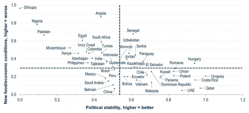 Obwohl das Ergebnis kein eindeutiges geografisches Muster erkennen lässt, enthält der „schlechteste“ Quadrant in der linken oberen Ecke eine Reihe von Ländern südlich der Sahara. In diesem Quadranten stellen die hohen Nahrungsmittelpreise große humanitäre, soziale und fiskalische Herausforderungen dar, wie die jüngsten Proteste in Kenia zeigen.