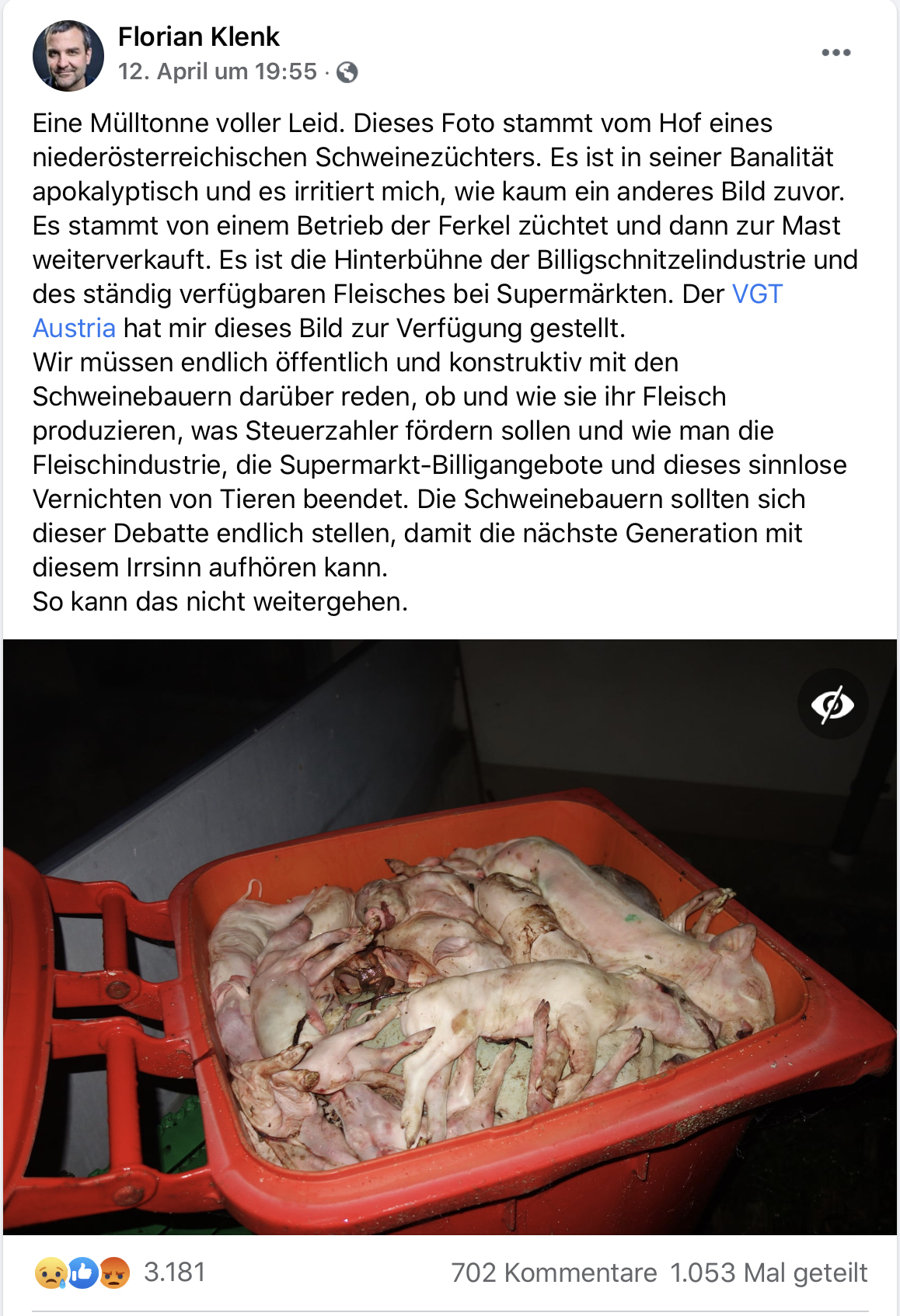 Sehr spannend war zu sehen, wie sie die Geschichte vom VGT weitergesponnen und eine Eskalation verursacht haben. Innerhalb weniger Stunden ist mit dem Posting „Eine Mülltonne voller Leid“ eine Welle über uns alle hereingebrochen. Alle Lager mussten schnell Stellung nehmen und haben es auch gemacht. Manchmal in guter Manier und manchmal wurden auch Grenzen unterschritten … der Fluch der sozialen Medien, die sich oft schnell ins „Unsoziale“ wandeln.