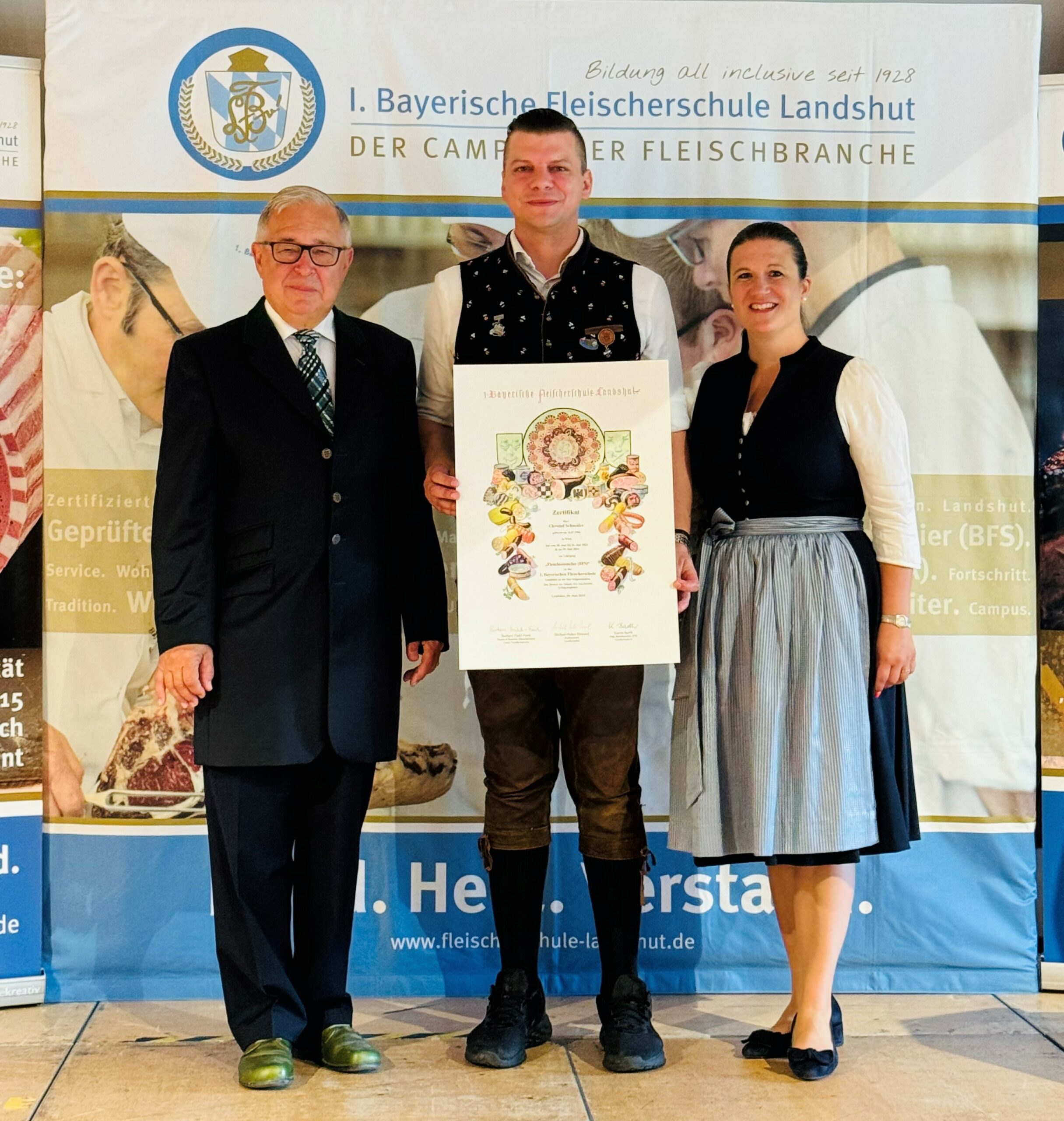 Alle Teilnehmer:innen büffelten 12 Wochen im 454. Meisterkurs der 1. Bayerischen Fleischerschule Landshut (1. BFS). Unter ihnen der Lackenbacher Clemens Schrifl (32). Schrifl schloss zuerst eine Ausbildung zum Lebensmitteltechnologen mit der Fachrichtung Fleischwirtschaft an der HTLLT Hollabrunn bevor er sich für die Weiterbildung zum Meister in Landshut entschied.