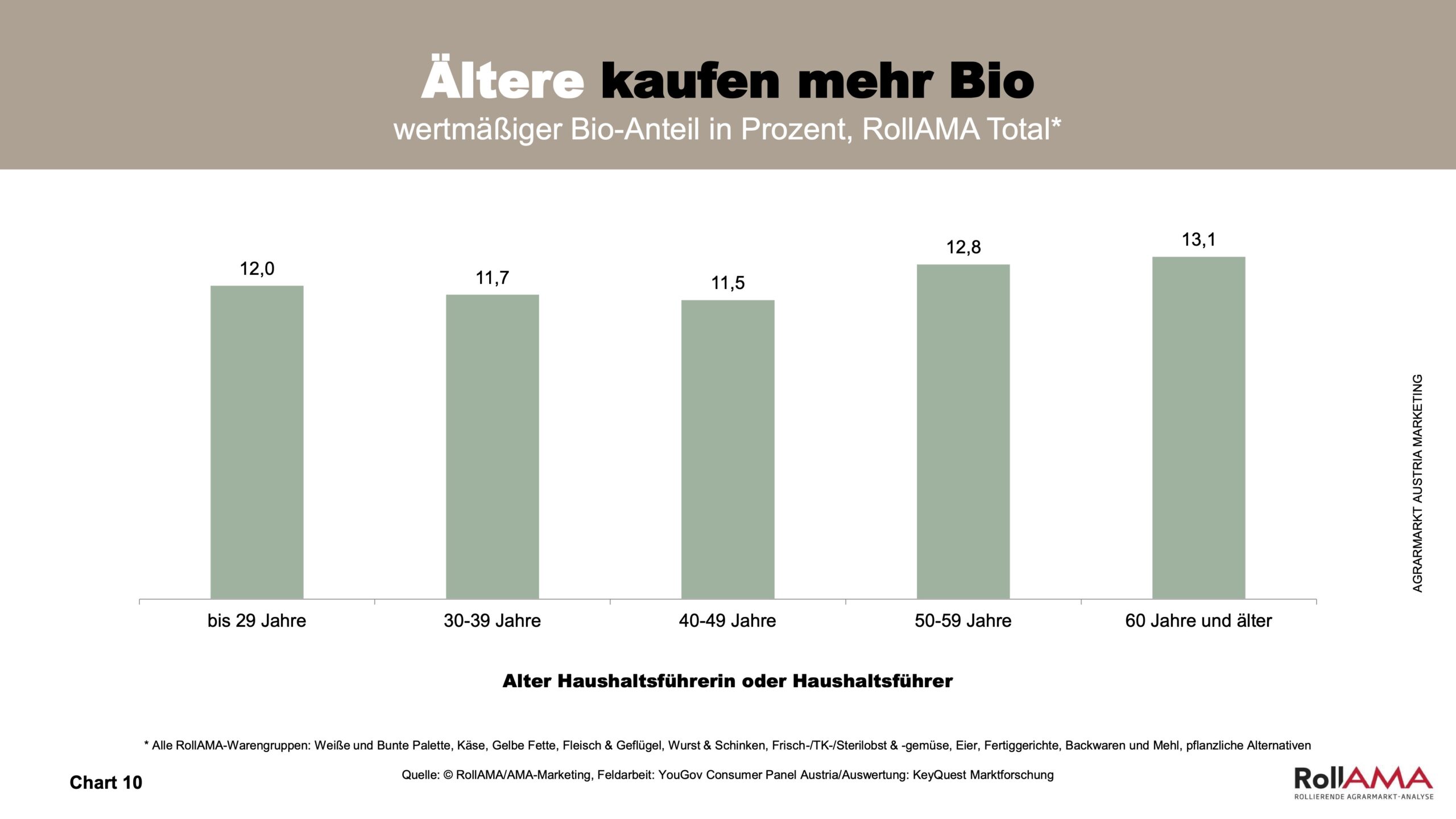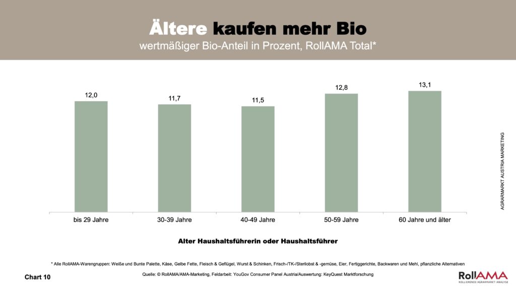 Sowohl ältere Konsumentinnen und Konsumenten ab 50 Jahren als auch junge Erwachsene bis 29 Jahren greifen überdurchschnittlich häufig zu Bio. Während Ältere besonderen Wert darauf legen, sich mit hoher Qualität von Lebensmitteln fit zu halten, stehen bei jüngeren Konsumentinnen und Konsumenten die bei Bio-Lebensmitteln verankerten Aspekte Nachhaltigkeit und Tierwohl im Fokus (Chart 10). Kleine Haushalte mit ein bis zwei Personen bevorzugen Bio ebenfalls stärker als große Familien, bei denen der Preis aufgrund der gekauften Mengen an Lebensmitteln häufig eine größere Rolle spielt – insbesondere bei teureren Produktgruppen wie Fleisch (Chart 11).
