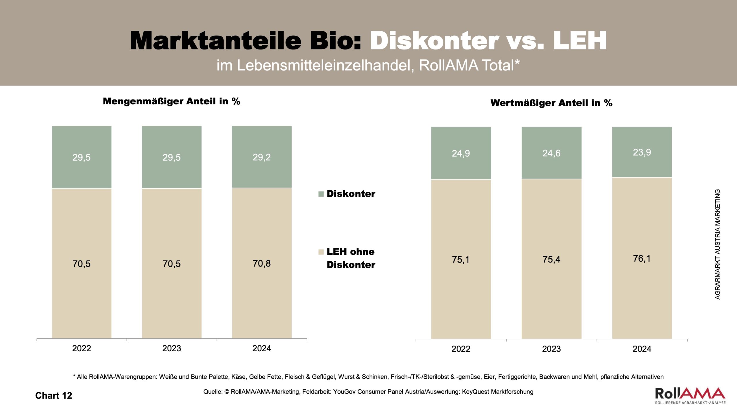 Die Verteilung der Marktanteile zwischen Supermärkten und Diskontern bleibt stabil. Diskonter haben mit knapp einem Viertel Umsatzanteil und rund 30 Prozent der Menge weiterhin einen festen Platz im Bio-Markt, doch der Lebensmitteleinzelhandel (LEH) bleibt die wichtigste Bezugsquelle für Bio-Produkte (Chart 12).