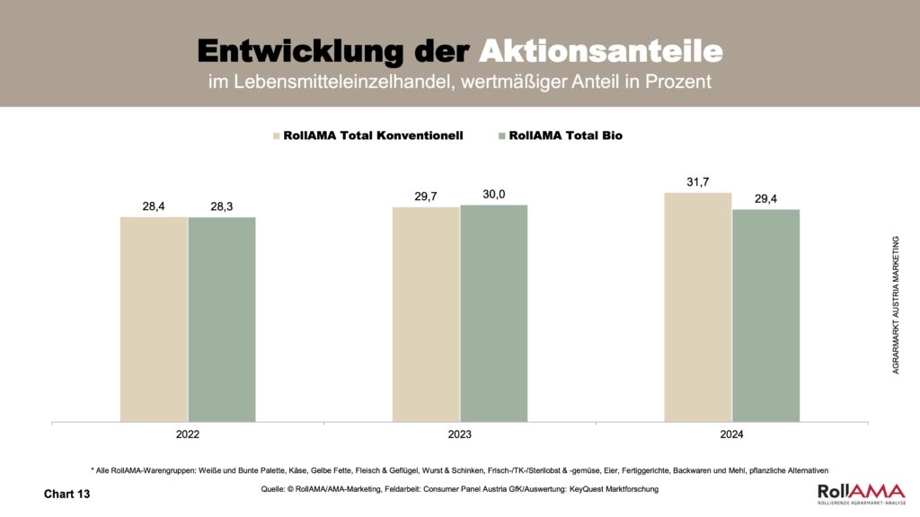 Obwohl auch Bio-Produkte stark in Aktionen beworben werden, ist der Aktionsanteil im Jahr 2024 etwas gesunken: 29,4 % der verkauften Bio-Produkte wurden im Rahmen von Preisnachlässen erworben (2023: 30,0 %) Chart 13). Eine Ausnahme bildet Bio-Fleisch: Hier bleibt der Aktionsanteil hoch, da der Preisunterschied zu konventionellem Fleisch größer ist und Preisnachlässe dazu beitragen, die Kaufentscheidung zugunsten von Bio zu erleichtern (Chart 14).