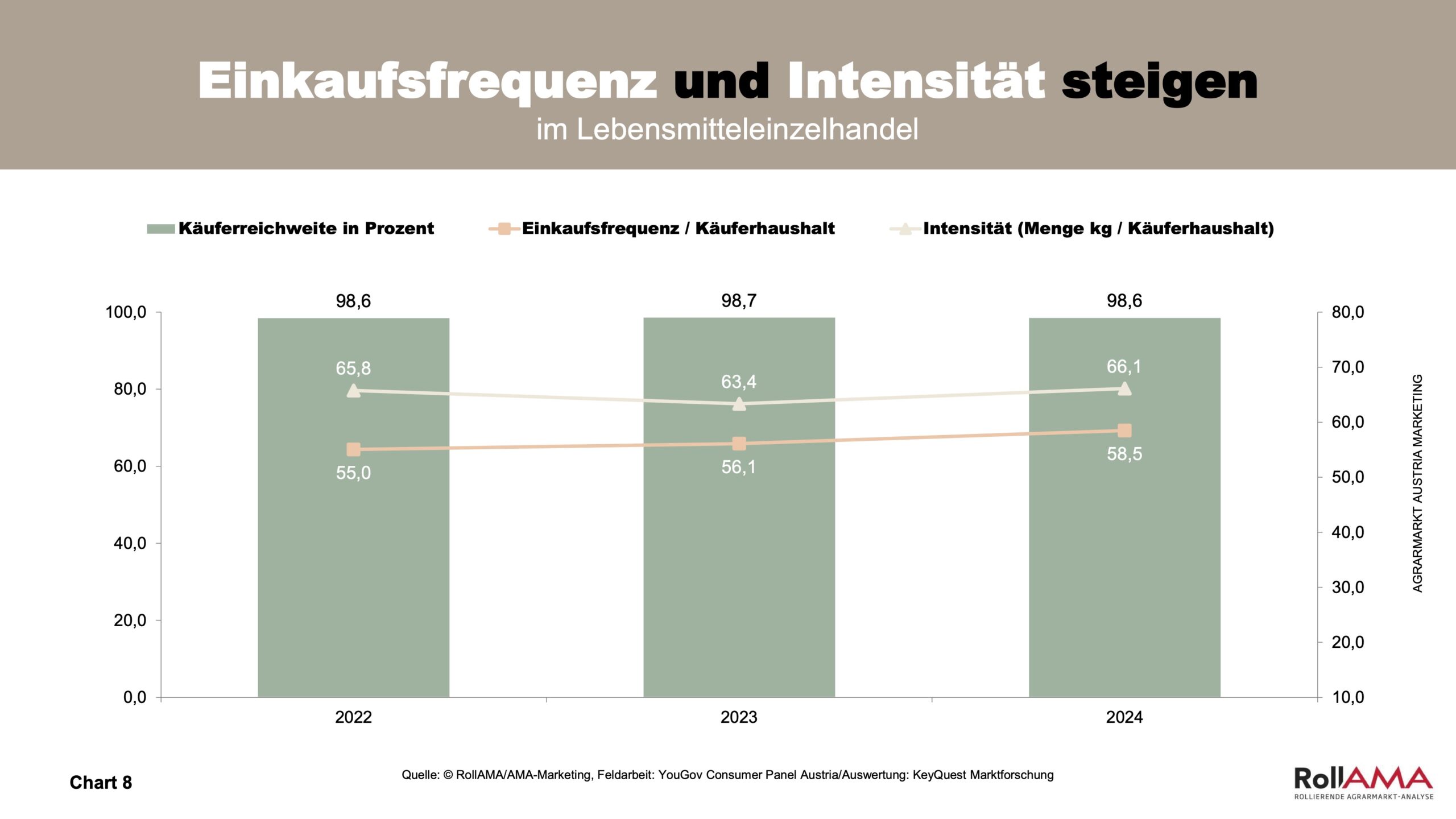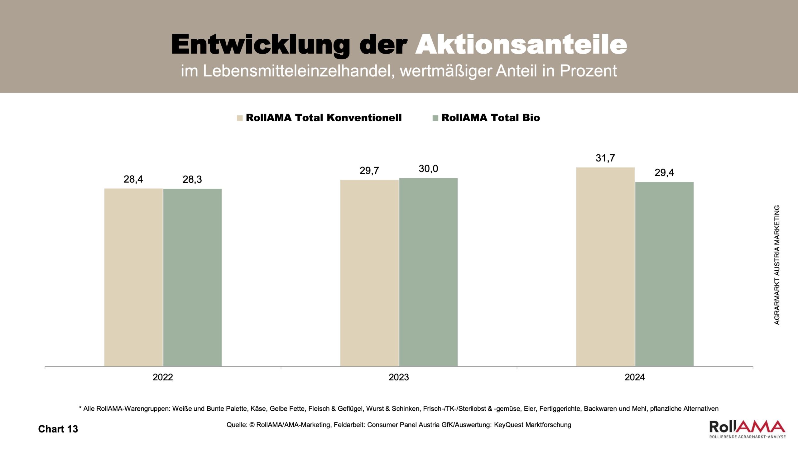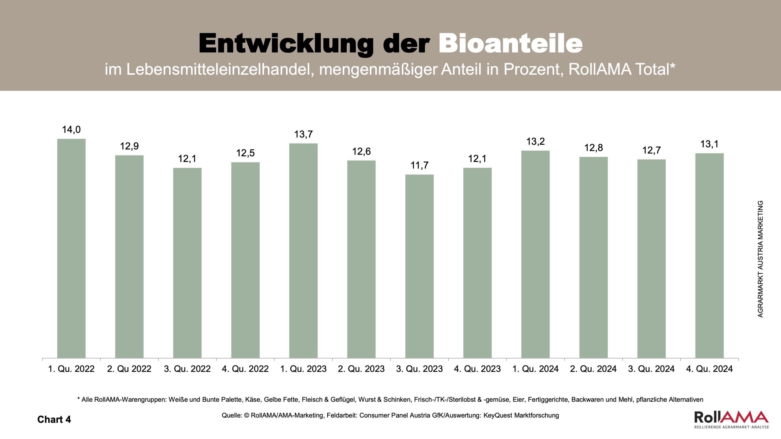 Die Schwankungen in den einzelnen Quartalen sind im Gegensatz zu den Vorjahren gering, was darauf hindeutet, dass Bio keinen Saisonen folgt, sondern ganzjährig eine hohe Bedeutung beim Lebensmitteleinkauf aufweist (Charts 3 und 4).