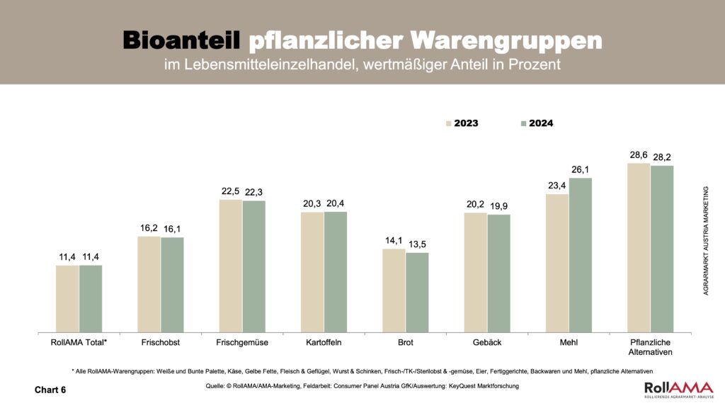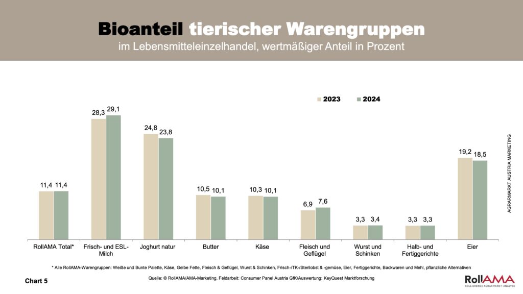 Der Markt für Biofleisch ist im Jahr 2024 weitergewachsen, auch wenn der Bioanteil mit 7,6 Prozent noch auf einem vergleichsweise niedrigen Niveau liegt. Die RollAMA-Zahlen belegen eine steigende Nachfrage nach Biofleisch – ein Hinweis darauf, dass Verbraucher zunehmend Wert auf Tierwohl und ethische Aspekte beim Einkauf legen. Auch Bio-Obst und -Gemüse gewinnen an Bedeutung, was auf veränderte Ernährungsgewohnheiten und neue Kochgewohnheiten zurückzuführen ist. Im Gegensatz dazu bleibt das Wachstum bei Bio-Eiern geringer, hier schränken auch Verfügbarkeitsengpässe das Angebot ein (Chart 7).