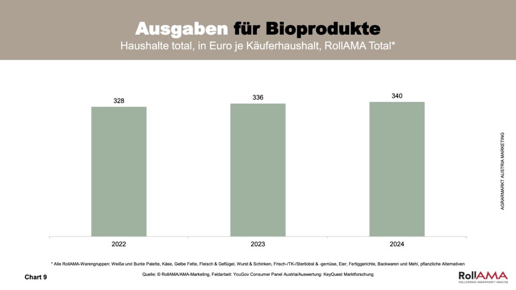Sowohl die Einkaufsfrequenz als auch die eingekauften Bio-Mengen pro Haushalt erreichten 2024 neue Höchstwerte: Im Durchschnitt wurden 66,1 kg Bio-Lebensmittel pro Jahr gekauft, die sich auf 58,5 Bio-Einkäufe pro Haushalt verteilten (Chart 8). Die jährlichen Ausgaben für Bio stiegen auf durchschnittlich 340 Euro pro Haushalt – auch das ein neuer Rekord (Chart 9).