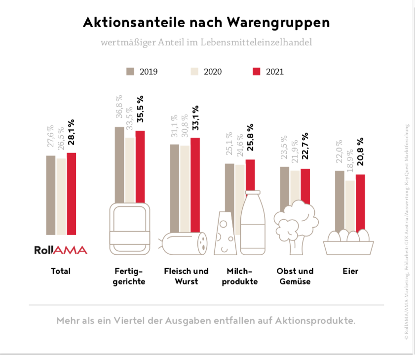 Bei den durchschnittlichen Preisen für Frischeeinkäufe gab es 2021 wenig Bewegung, in manchen Warengruppen fielen sie sogar deutlich. Das lag auch am hohen Aktionsanteil, der nach einem Rückgang in der Anfangszeit der Pandemie nun erstmals mehr als 28 % wertmäßig erreichte. Fleisch, Wurst und Fertiggerichte gehören zu den Spitzenreitern bei der Rabattierung, aber auch vergünstigte Milchprodukte.