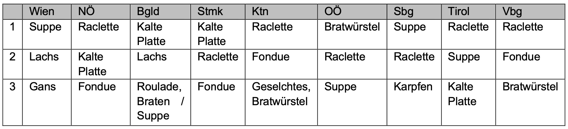 In manchen Bundesländern gibt es auch besonders ausgeprägte Traditionen: In Oberösterreich sind Bratwürstel für jeden Zweiten (52 Prozent) das Gericht der Wahl, in Salzburg isst beinahe die Hälfte (48 Prozent) Suppe, in Vorarlberg muss es für ebenso viele Raclette sein. In der Steiermark steht die kalte Platte bei einem Drittel zu Weihnachten am Tisch.