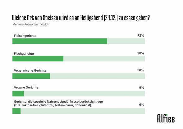 Das Weihnachtsmenü umfasst laut Alfies-Umfrage für fast drei Viertel Fleisch, gefolgt von Fisch und vegetarischen Gerichten.