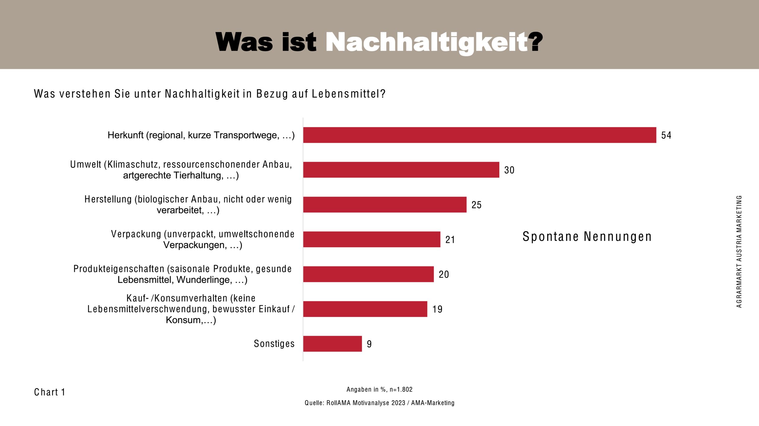 Was den Konsumentinnen und Konsumenten im Bereich Nachhaltigkeit wichtig ist, hat eine RollAMA-Motivanalyse erfragt. Zu allererst wurde aber die Frage gestellt, was für sie Nachhaltigkeit in Bezug auf Lebensmittel bedeutet (ungestützt). Für mehr als die Hälfte der Befragten (54 %) bedeutet sie spontan Herkunft – konkret verbinden sie damit regionale Lebensmittel mit kurzen Transport- und Lieferwegen, direkt vom Bauernhof bzw. aus Österreich. Auch Begriffe zum Thema Umwelt und Herstellung werden mit Nachhaltigkeit verbunden (Chart 1).