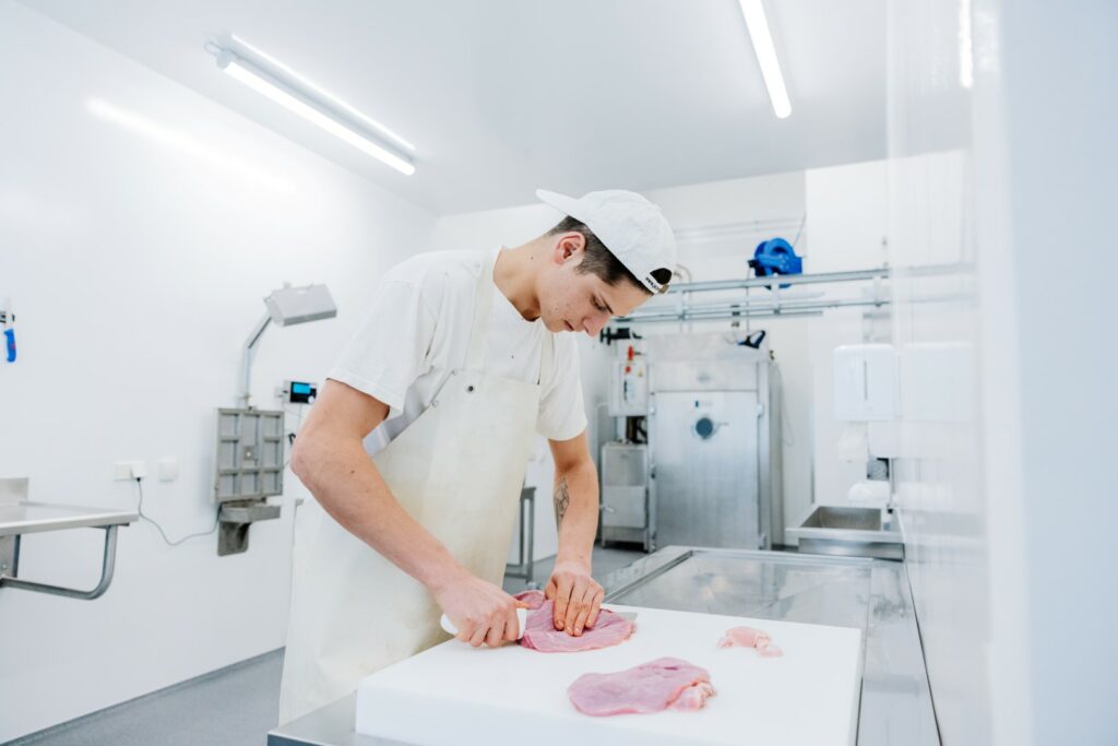 Eine Besonderheit des Betriebs stellt auch der Fokus auf Lammfleisch dar. Denn nicht erst seit der Pionierarbeit von Josef Schett und seiner für Felle und Naturkosmetik bekannte Marke „Villgrater Natur“ sind Schafe die Tiere des Tals schlechthin. Geschlachtet sollen die Lämmer das ganze Jahr über werden, auch wenn der Schwerpunkt zu Ostern und im Herbst liegen wird. Dann kommen die rund 400 Schafe von den Almen zurück in die Ställe des Tals. Wem all das bereits viel für einen Newcomer in Sachen Schlachtung und Veredelung vorkommt, der bekommt vom Geschäftsführer-Duo Mair und Schett noch mehr Zukunftsmusik serviert: „Wir haben ausreichend Platz und möchten uns zukünftig auch im Bereich Frischfisch und Fischverarbeitung betätigen.“ Und dann wäre da noch der Webshop, an dem die zehn Gesellscha!er ebenfalls bereits basteln.