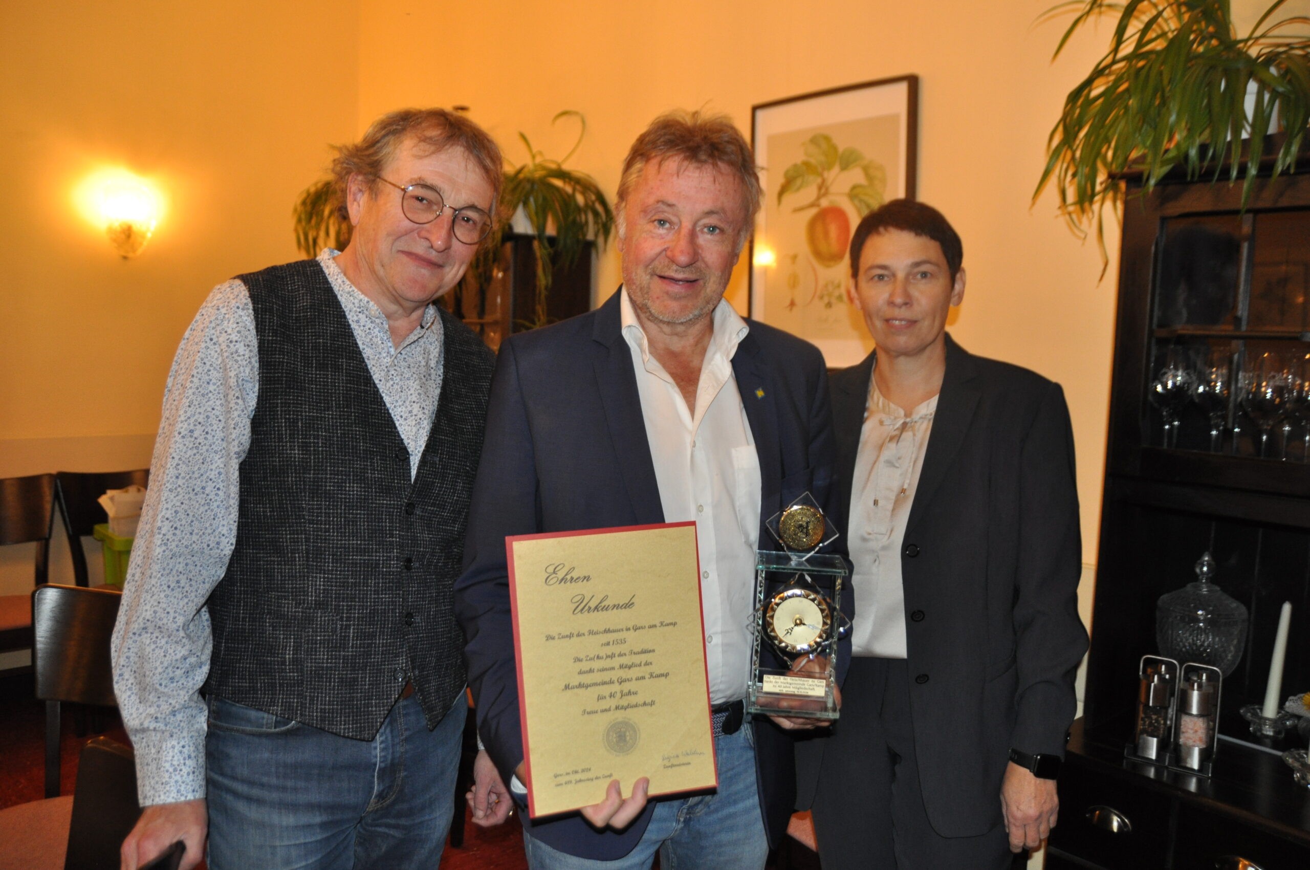 Zunftbruder Julius Kiennast feierte heuer seinen 75. Geburtstag und wurde in Abwesenheit geehrt. Die Zunftbrüder Wolfgang Kocourek (60. Geburtstag) und Christoph Kolobratnik (35. Geburtstag) erhielten ebenso Präsente sowie Bürgermeister Martin Falk für die 40-jährige Mitgliedschaft der Marktgemeinde Gars am Kamp und deren Unterstützung für die Zunft. Als Dank und Anerkennung für diese langjährige Mitgliedschaft erhielt der Gemeindechef eine Uhr mit dem Zunftsiegel. Mit köstlichem Bio-Cordon-bleu, Haustorte, edlen Tropfen und fachlichen Gesprächen klang der Abend stimmungsvoll aus.