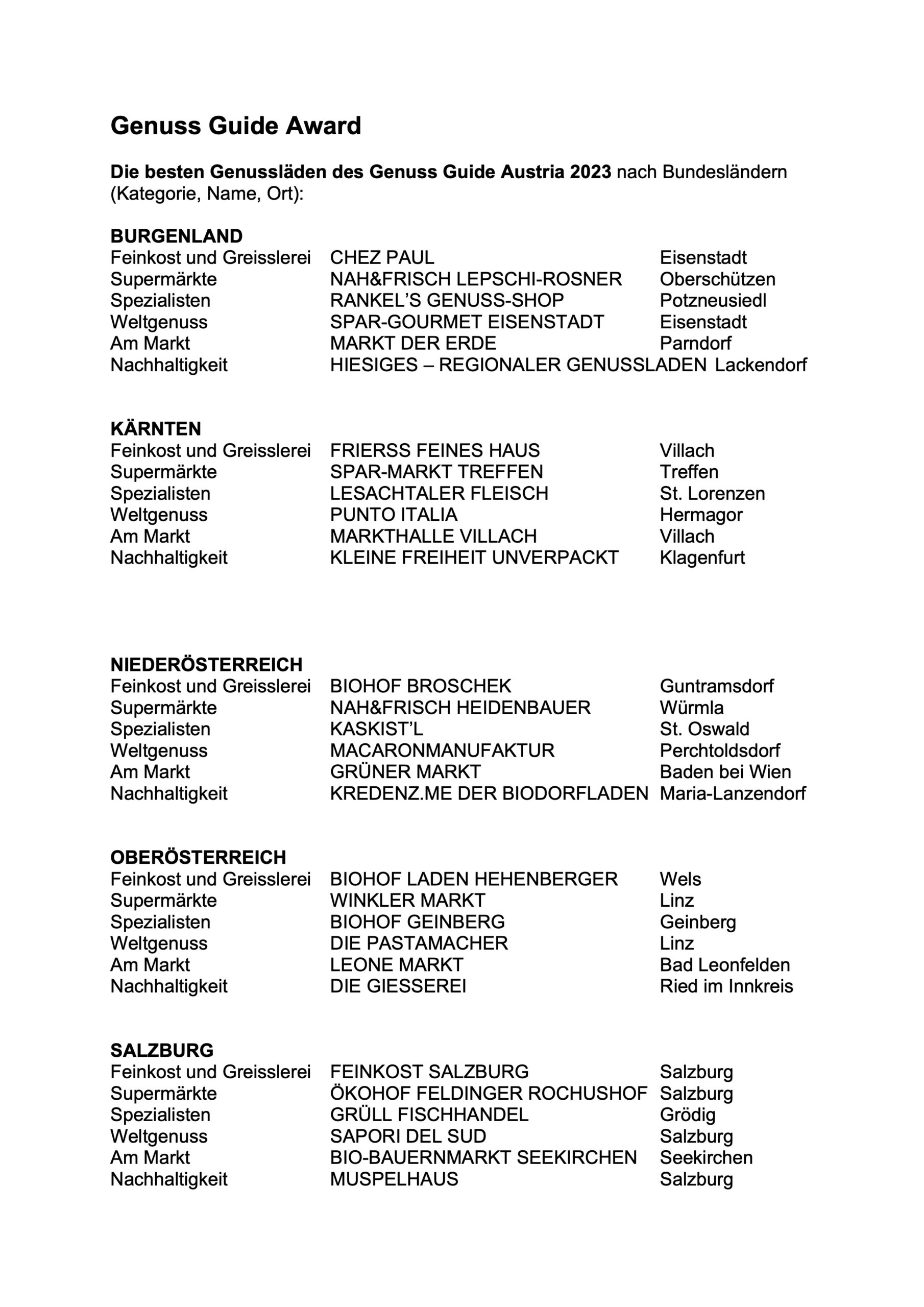 Demnach ist jedes im Guide angeführte Geschäft ein besonderes. Pro Bundesland werden überdies die besten Betriebe in den fünf Hauptkategorien – Feinkost und Greisslerei, Supermarkt, Spezialisten, Weltgenuss und Am Markt – für ihren außergewöhnlichen Einsatz, mit dem Genuss Guide Award ausgezeichnet. Ebenso wird das jeweils beste Geschäft zum heurigen Schwerpunktthema Nachhaltigkeit geehrt.