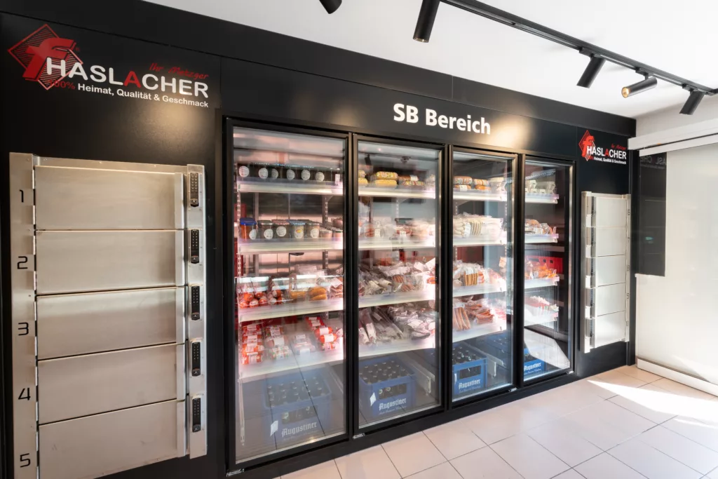 Ein Paradebeispiel für die Umsetzung dieses Konzepts ist die bayerische Metzgerei Haslacher in Langenpreising. Die Inhaber haben sich für Hanke entschieden, um ihren Laden in einen Hybridbetrieb umzuwandeln. Das Ergebnis ist eine beeindruckende Kombination aus traditioneller Metzgerei und einem 24-Stunden-Shop. Kunden können per WhatsApp bestellen und die Ware aus einem sicheren Bereich abholen, der nach Geschäftsschluss zugänglich ist. Die Ausstattung ist top. Hanke hat die Metzgerei mit einer über sieben Meter langen Santana-Theke mit Granitauslage ausgestattet. Die Heißtheke wurde erweitert und eine kleine Bäckereiabteilung wurde integriert. Glaswände kombiniert mit warmen Holztönen schaffen ein einladendes Ambiente. Für das optimale Beleuchtungskonzept wurden Lichtschienen und Strahler eingesetzt.
