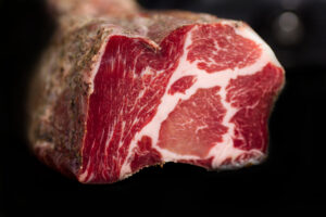 Mit Meersalz und Kräutern mild gebeizt. Die Nackenstücke der Schweine werden hierfür mit Meersalz und mediterranen Kräutern mild gebeizt und mehrere Monate luftgetrocknet. Durch die spezielle Art der Herstellung und die charakteristische Marmorierung dieser Fleischteile entwickelt der Coppa sein feines Aroma und seine wunderbar zarte Textur.