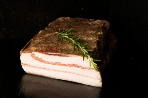 Zart schmelzend. Der Rückenspeck von Wollschweinen wird mit einer Komposition aus Meersalz, Kräutern und Charapita über Monate gebeizt. Am Gaumen ist das „Weiße Gold“ zart schmelzend und hat ein würziges, exotisches, leicht scharfes Aroma. Er kann als Vorspeise pur genossen werden oder dient als hervorragende, würzige Zutat für viele delikate Gerichte.