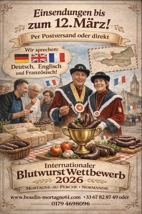Wenn im März die normannische Kleinstadt Mortagne-au-Perche zur „Hauptstadt der Blutwurst“ wird, blickt die internationale Fleischerwelt auf einen Ort: zur traditionsreichen Foire au Boudin. Bis zu 30.000 Besucher strömen jedes Jahr zur begleitenden Messe, bei der mehrere Tonnen Blutwurst verkostet, verkauft und gefeiert werden.