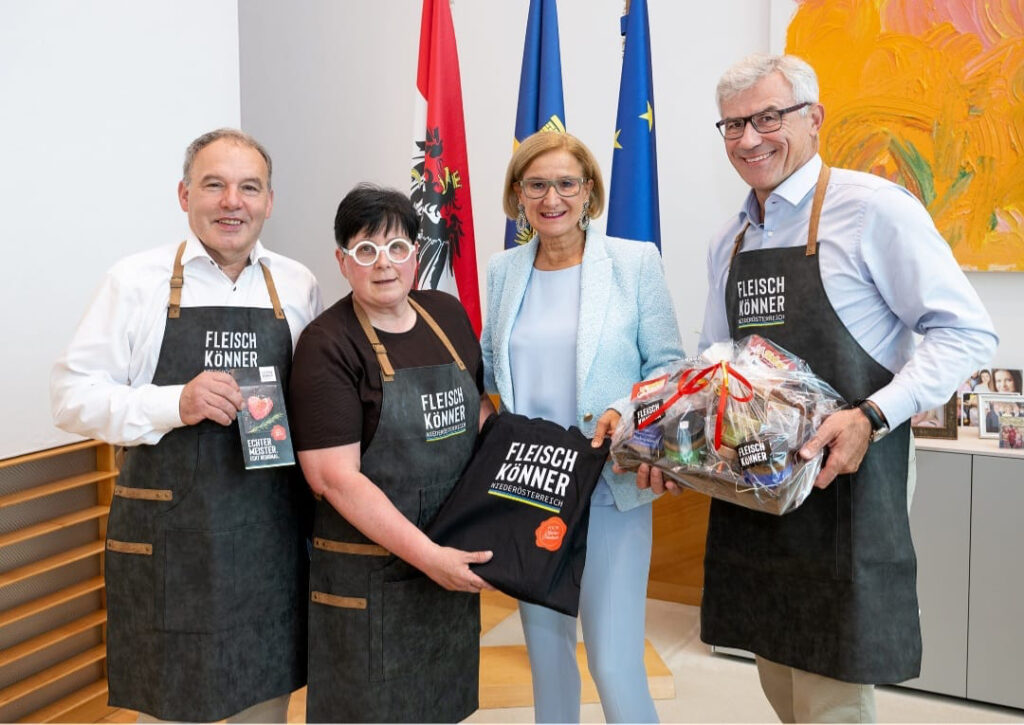 Jakob Ellinger, Doris Steiner und Wolfgang Seidl haben das Fleisch-Könner Projekt Landeshauptfrau Johanna Mikl-Leitner vorgestellt – sie hat ihre Unterstützung zugesichert. © Beigestellt