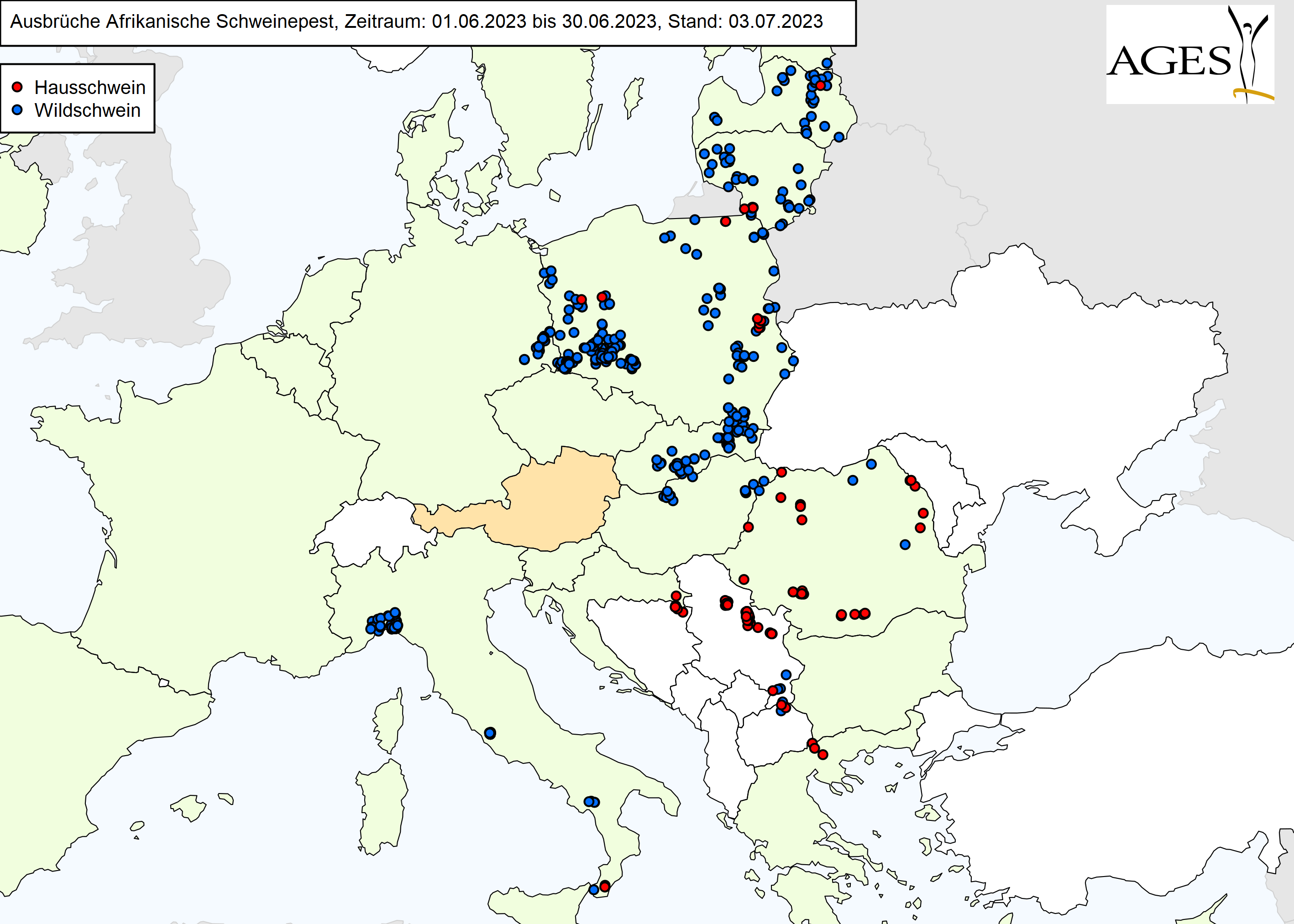 Die aktuelle, steigende Verbreitung der Krankheit in den Balkan-Ländern ist mit Sicht auf den starken Personenverkehr und Austausch in der Urlaubszeit für Österreich mehr als besorgniserregend. Auch ist die Situation in unseren direkten Nachbarländern wie Deutschland, Tschechien, Slowakei, Ungarn und Italien unverändert schwierig, da vermehrt Ausbrüche von ASP bei Wildschweinen vorkommen. Einen umfassenden Überblick der Tierseuchenlage in Europa und die Risikoeinschätzung für Österreich liefert das monatlich aktualisierte Tierseuchenradar – Juni 2023 – AGES. Derzeit beträgt die kürzeste Distanz eines bestätigten ASP-Falles zur österreichischen Staatsgrenze lediglich 109 km und befindet sich in der Slowakei.