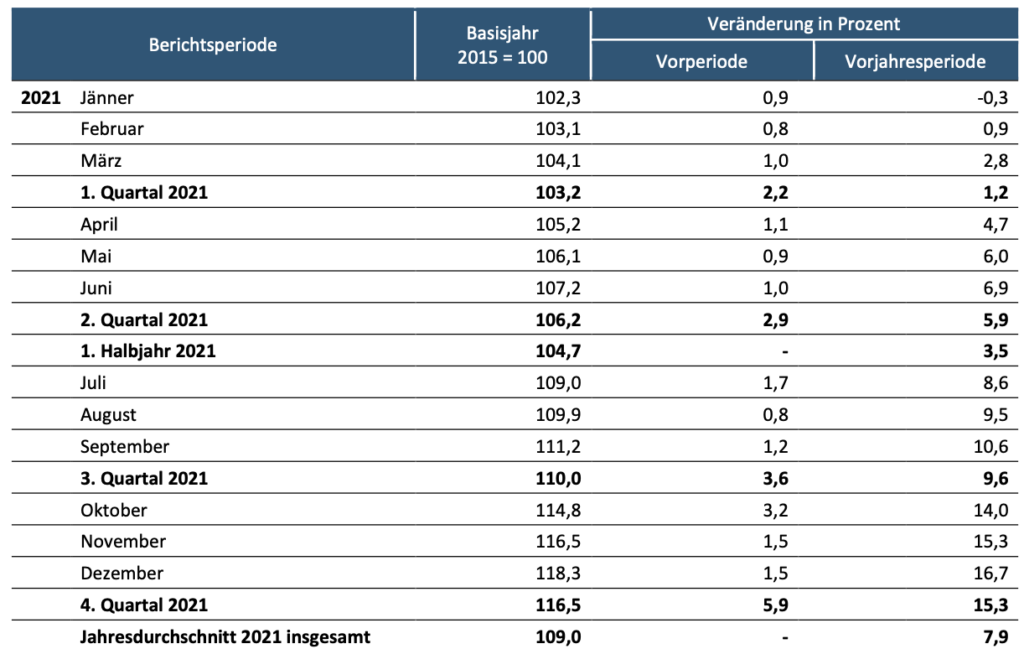 Für die steigende Indexentwicklung im Jahr 2022 (+19,4 %) waren hauptsächlich die starken Preisanstiege im Bereich Energie (+49,1 %) verantwortlich. Im Vorjahr 2021 wurde für Energie noch ein durchschnittlicher Preisanstieg um 16,6 % beobachtet. Speziell die Teuerungen bei industriell erzeugten Gasen, Dienstleistungen der Gasversorgung (+51,4 %), elektrischem Strom und Dienstleistungen der Elektrizitätsversorgung (+49,2 %) sowie bei Mineralölerzeugnissen ließen den Index für Energie im Jahr 2022 ansteigen.