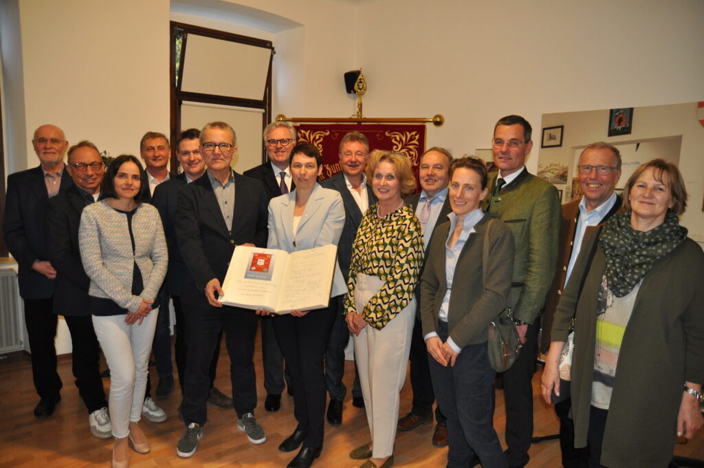 Museumsvertreter, Politiker, Kammerfunktionäre und Unterstützer der Bewerbung für das „Immaterielle Kulturerbe“ trugen sich als Gratulanten ins Zunftbuch ein: Anton Ehrenberger, Josef Wiesinger, Sylvia Weber, Andreas Riedl, Franz Linsbauer, Martin Fritz, Reinhard Kainz, Zunftmeisterin Regina Waldum, Bürgermeister Martin Falk, Margareta Jarmer, Jakob Ellinger, Heidrun Bichler-Ripfel, Bezirkshauptmann Stefan Grusch sowie Rudolf und Gerti Menzl (v. l.). © HaRo