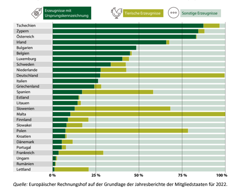 Der Hof analysierte die jährlichen Kontrollberichte der 27 Mitgliedstaaten für 2022, die der Kommission vorgelegt wurden. Die Mitgliedstaaten führten ganz unterschiedliche Arten von Kontrollen durch (siehe Abbildung 14). Einige Mitgliedstaaten konzentrierten sich bei ihren Kennzeichnungskontrollen auf die Ursprungskennzeichnung, während andere den Schwerpunkt auf tierische Erzeugnisse oder andere Erzeugnisse legten (einschließlich der Kontrolle von nährwert- und gesundheitsbezogenen Angaben).