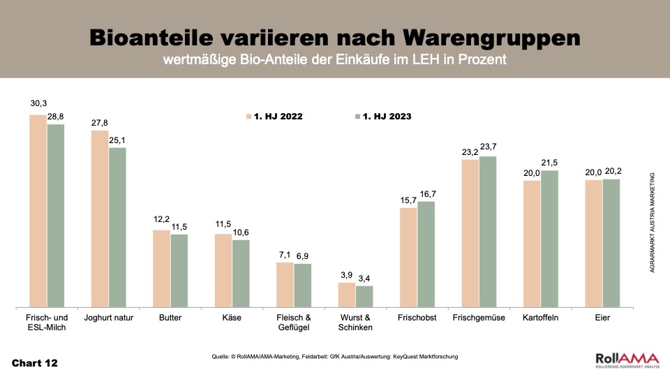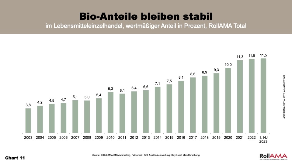 Die Bio-Marktanteile blieben stabil und erreichten im ersten Halbjahr 2023 den Vorjahreswert 11,5 Prozent (Chart 11).