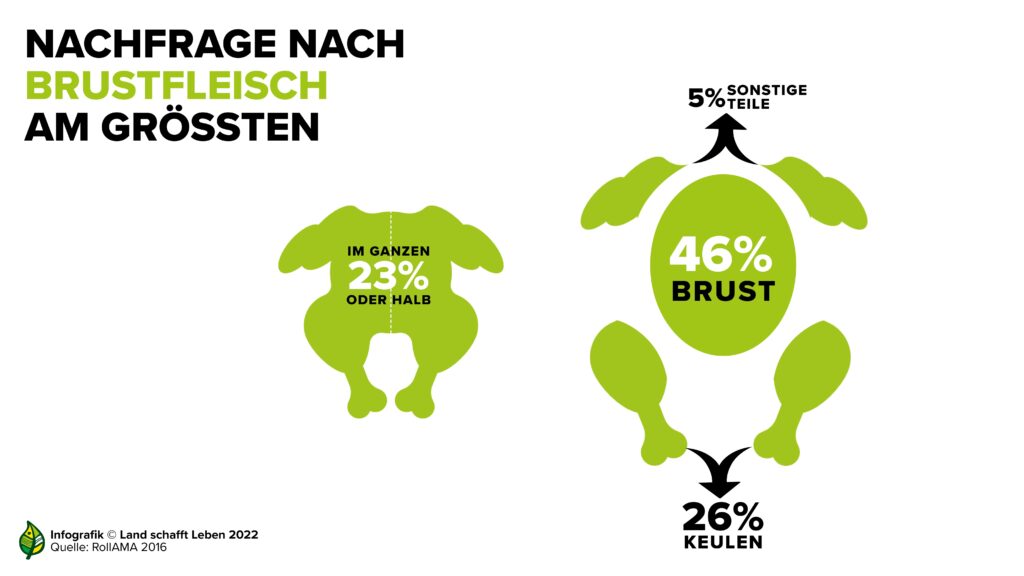 Österreich kann sich zu 88 % mit Hühnerfleisch selbst versorgen, wobei einige Teile beliebter sind als andere. Besonders beliebt ist bei den Konsument:innen im Handel wie auch in der Gastronomie das Brustfleisch. Bei steigender Tendenz macht es rund 46 % des gesamten Verkaufswertes im Lebensmitteleinzelhandel aus, die Keulen knapp ein weiteres Viertel. Ganze oder halbe Hühner hingegen werden immer seltener gekauft. Mit ein Grund dafür sind die kleiner werdenden Haushalte. Die Verarbeitungsbetriebe stellt das vor eine Herausforderung: Sie müssen neue Produkte und Konzepte entwickeln, um alle Teile des Huhns zu verkaufen. Österreichisches Hüherfleisch wird auch exportiert, hauptsächlich ins EU-Ausland.