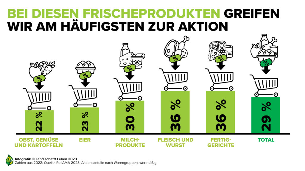 Rund 30 Prozent des Sortiments im heimischen Lebensmitteleinzelhandel sind rabattiert. Das macht Österreich zu einem der Länder mit den größten Aktions- und Rabattanteilen überhaupt. Dabei gibt es Unterschiede zwischen den Lebensmittelgruppen. Bier etwa wird besonders häufig rabattiert gekauft, bei Schweinefleisch ist es rund die Hälfte, die in Aktion erworben wird. Laut RollAMA kauften 20 Prozent der Konsumentinnen und Konsumenten, die Schweinefleisch kaufen, dieses im ersten Halbjahr 2023 sogar ausschließlich, wenn es in Aktion war.