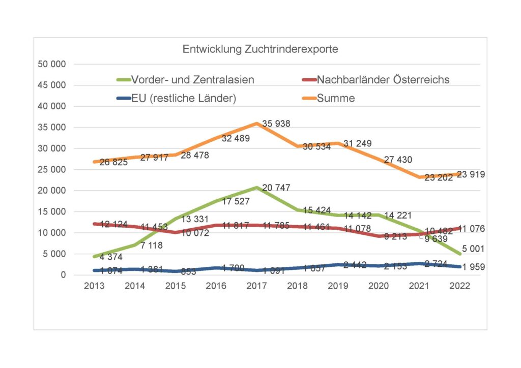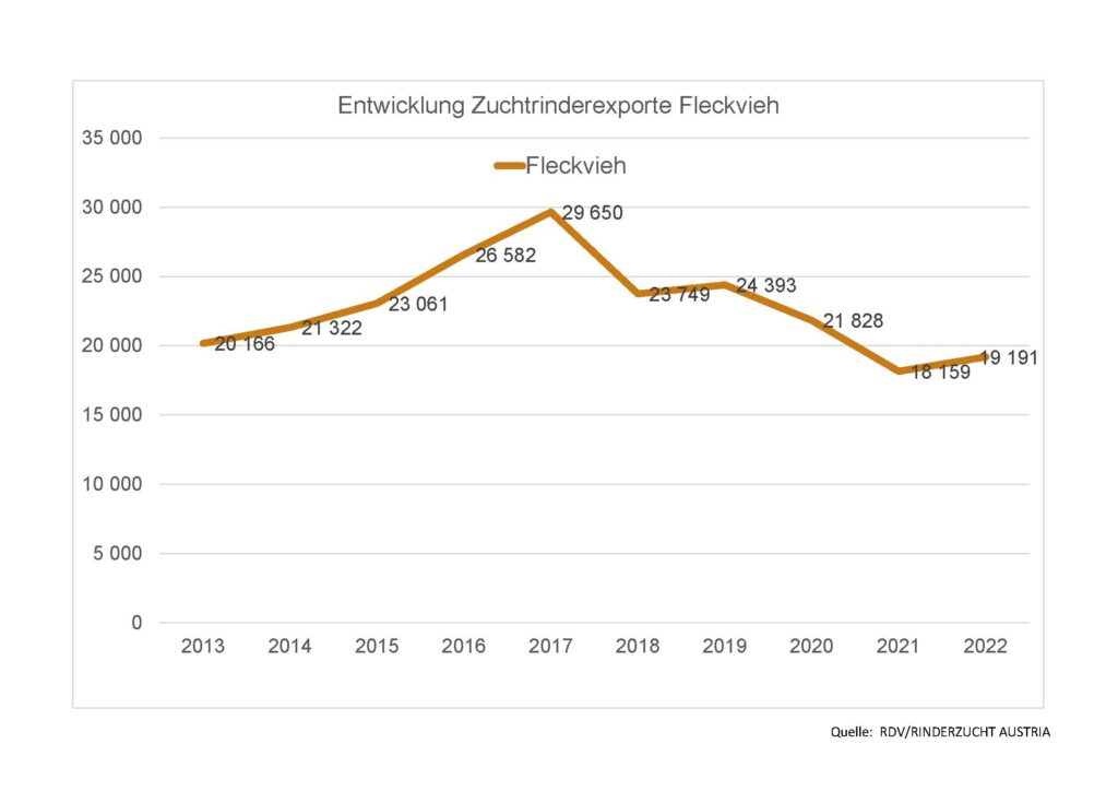 Im Jahr 2022 wurden 23.919 Zuchtrinder exportiert, um 717 Stk. oder 3,1 % mehr als im Vorjahr. Davon wurden 55 % innerhalb der Europäischen Union vermarktet, die restlichen 45 % nach Drittländern. Italien ist jenes Land mit den meisten importierten österreichischen Zuchttieren. Das Land ist schon seit jeher ein wichtiger Handelspartner der heimischen Rinderwirtschaft und Rinderzucht.