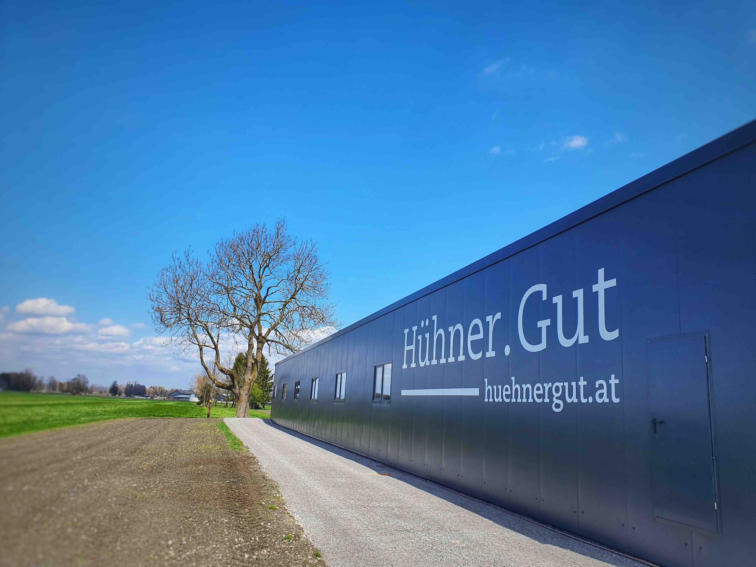 Im Jahr 2019 wurde es eröffnet. Ein Gebäude in Schwarz steht in der grünen Landschaft. Edel sieht es aus und minimalistisch mit dem einfachen Schriftzug „Hühner.Gut“. In diesem Gebäude befinden sich nicht nur die verschiedenen Stallabteile für die Tiere, sondern auch der Aufzuchtraum für die Küken und das Herzstück der Vermarktung: die Schlacht- und Verarbeitungs- räume. Die Schlachtung ist kreisförmig angelegt und ein Rondell sorgt für eine beinahe automatische Schlachtung, ähnlich einer Schlachtbandanlage, aber im kleineren Stil. Mehrmals pro Woche steht Lucas selbst noch im Schlachtraum und ist mit seinem Mitarbeiter dabei den Rohstoff für das stetig wachsende Sortiment herzustellen. Transparenz wird hier gelebt und gleich dahinter befindet sich auch schon der erste Verkaufsraum mit Automaten und somit immer zugänglich.