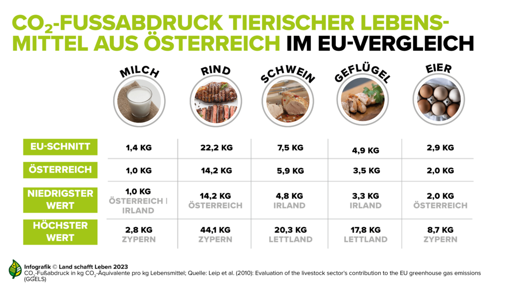 Das ist einer der Gründe, warum Lebensmittel aus Österreich im Vergleich meist einen besseren CO2-Fußabdruck haben. Dieser ist hierzulande nämlich bei der Produktion von Rindfleisch, Milch und Eiern im EU-Vergleich am kleinsten. „Viele wissen gar nicht, dass die österreichische Landwirtschaft in vielerlei Hinsicht um einiges klimaeffizienter produziert als die meisten anderen EU-Länder, von Drittstaaten ganz zu schweigen“, meint Royer. Doch eine klimafreundliche Lebensmittelproduktion entspricht nicht immer in allen Parametern dem gesellschaftlichen Ideal.