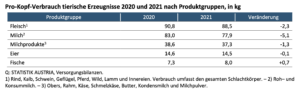 Österreichs landwirtschaftliche Betriebe produzierten im Jahr 2021 4,9 Mio. t tierische Erzeugnisse, damit lag die Produktion geringfügig über dem Niveau des Vorjahres.