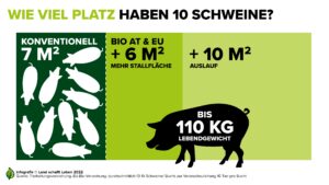 Zusätzlich müssen die Schweine Zugang zu einem befestigten Auslauf haben, ein Weidezugang ist allerdings nicht vorgeschrieben. Bio-Schweine haben in Österreich außerdem mehr Platz: Während die gesetzlich vorgeschriebene Mindestfläche für ein konventionell gehaltenes Mastschwein bis zu einem Gewicht von 110 Kilo bei 0,7 Quadratmetern liegt, müssen einem Bioschwein in dieser Gewichtsklasse 1,3 Quadratmeter Stallfläche und ein Quadratmeter Auslauf zur Verfügung stehen.