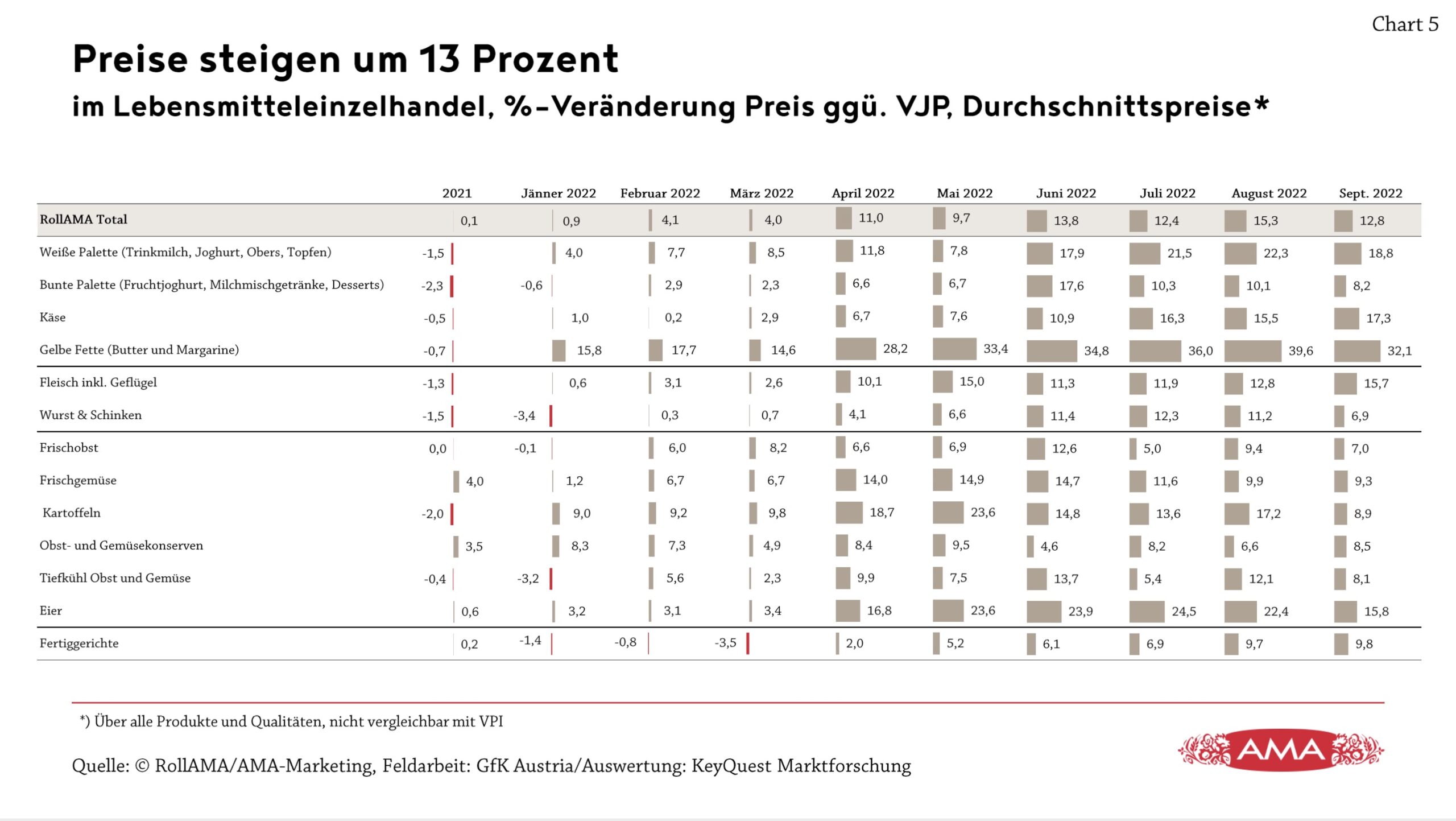 Die Preissteigerungen für die RollAMA-Frischeprodukte lagen im September bei 12,8 Prozent, also über der allgemeinen Inflationsrate von 10,7 Prozent. Der heurige Höchststand zeigte sich im August mit über 15 Prozent. Die höchsten Ausschläge sind bei Butter, Milch, Käse und Eiern im Vergleich zum Vorjahr zu beobachten. Wesentlich geringer als bei Fleisch (+ 16 %) fallen die Preiserhöhungen für Wurst und Schinken aus (+ 7 %).