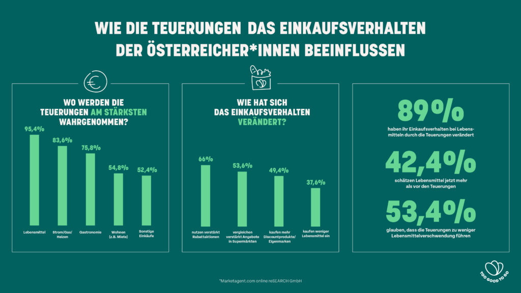 Too Good To Go führte im April 2023 mit dem Marktforschungsinstitut Marketagent eine repräsentative Umfrage mit rund 500 Befragten (Österreicher*innen im Alter zwischen 18 und 69 Jahren) zum Thema „Teuerungen und Einkaufsverhalten” in Österreich durch.