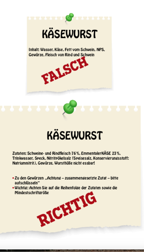 • Zusammengesetzte Zutaten sind aufzuschlüsseln – ein prominentes Beispiel aus der Fleischbranche ist Nitritpökelsalz – richtig lautet die Kennzeichnung: Nitritpökelsalz (Speisesalz, Konservierungsstoff: Natriumnitrit). Achtung: Das gilt auch für Gewürzmischungen! Erleichterungen gibt es für „nur Gewürze“ oder „nur Kräuter“.